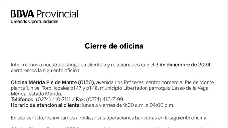 BANCO PROVINCIAL OFICINA MÉRIDA PIE DE MONTE (0150) 28 NOV 24