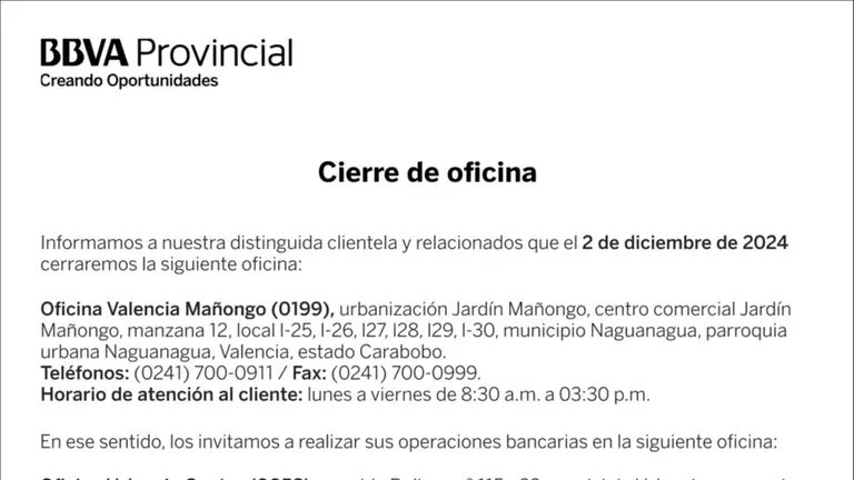 BANCO PROVINCIAL OFICINA VALENCIA MAÓNGO (0199) 27-NOV-24