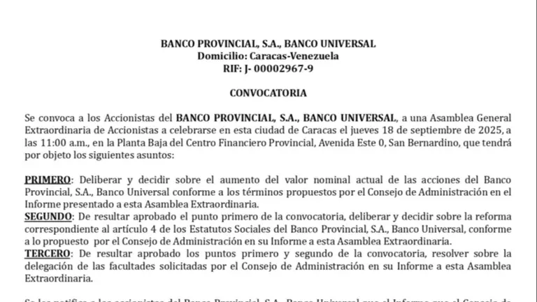 BANCO PROVINCIAL, S.A., BANCO UNIVERSAL CONVOCATORIA 15 AGO 25