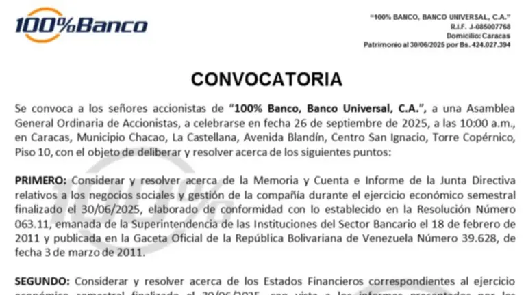 CONVOCATORIA ASAMBLEA 100% BANCO 1 SEP 2025