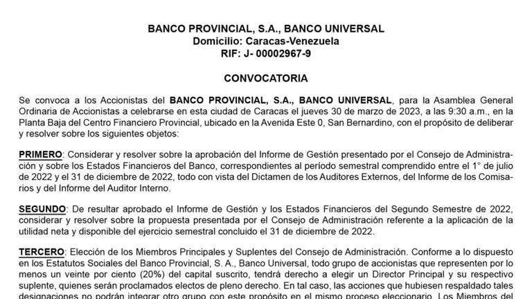 CONVOCATORIA ASAMBLEA ORDINARIA | BANCO PROVINCIAL 23 FEB 2023