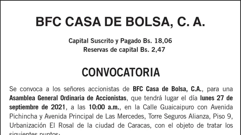 CONVOCATORIA | BFC Casa de bolsa AGO 2021