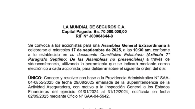LA MUNDIAL DE SEGUROS C.A. CONVOCATORIA 9 SET 25