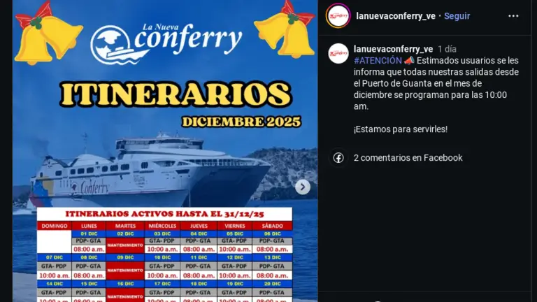 Al igual que en el mes de diciembre, las salidas desde el Puerto de Guanta en el estado Anzoátegui serán a las 10 de la mañana, a excepción de los días 6, 13, 20 y 27 de enro que la unidad se encontrará en mantenimiento.