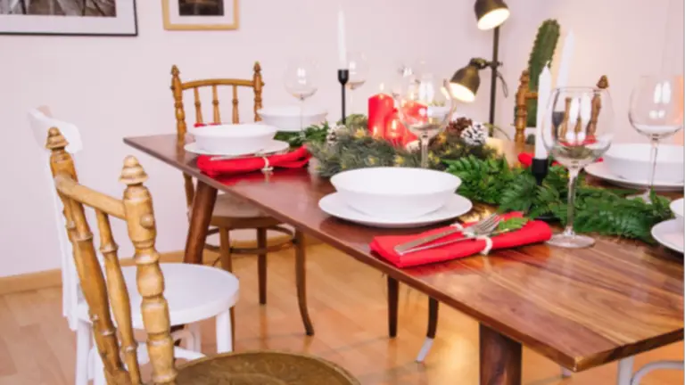 Doblar las servilletas de forma creativa o añadir colores navideños como rojo o verde ayuda a reforzar el ambiente festivo. La cristalería clara y bien situada no solo es útil para la comida y la bebida, sino que también refleja la luz y hace que la mesa parezca más luminosa.